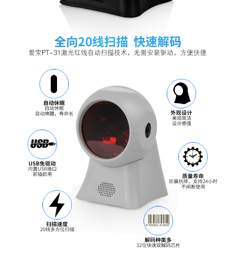商品名称:爱宝(Aibao) PT-31 扫描一二维扫描枪 激光扫描平台 扫码枪 条码扫描器 升级版一二维码黑色